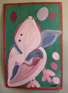 We lived a few blocks from Mose, so I visited with him occasionally. Sometimes I bought something; most times we just talked. One day I wanted to purchase a painting that was hanging above the bed that Mose was lying in at the time. He told me: “Well, honey, just climb right on up here and get it!”