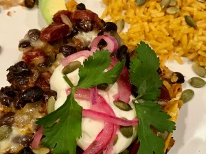 - Let casserole rest 10 minutes, then serve topped with dollops of lime crema, some pickled onion, pumpkin seeds and cilantro leaves.