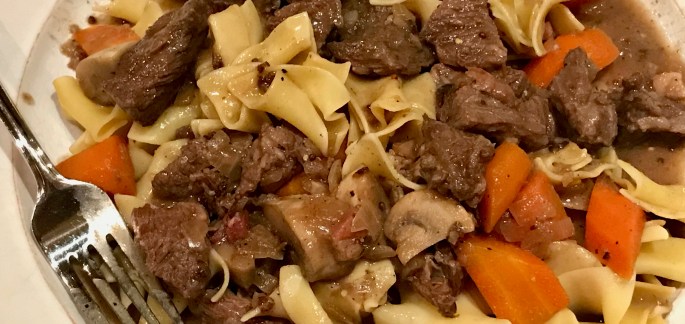 I've looked forward all week to an afternoon of cooking. It's cold and gray outside, and I wanted to make something warm and comforting. A from-scratch stew--rich and deeply savory--is about as comforting as it gets. This recipe from the New York Times Cooking website is an exercise in the meditative process of quality time spent … Continue reading Sunday Dinner: Dijon and Cognac Beef Stew