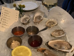 Raw oysters and royal reds at The Ordinary (544 King Street). This fancy oyster hall is in a beautiful historic building that used to house a bank. The restaurant belongs to James Beard Award-winning chef Mike Lata (Best Chef Southeast 2009) and business partner Adam Nemirow, the same team behind FIG (another personal favorite place). My daughter Allison knew I was going to The Ordinary that evening, and she called ahead and ordered an assortment of South Carolina raw oysters that included Roddy Rocks and Single Ladies and Sea Clouds and long, thin Capers Blades. I skipped the cocktail sauce in favor of the ginger mignonette. A glass of cold Les Gras Moutons Muscadet was perfect, too. I loved my dish of charcoal-grilled royal red shrimp over polenta with shrimp nage.