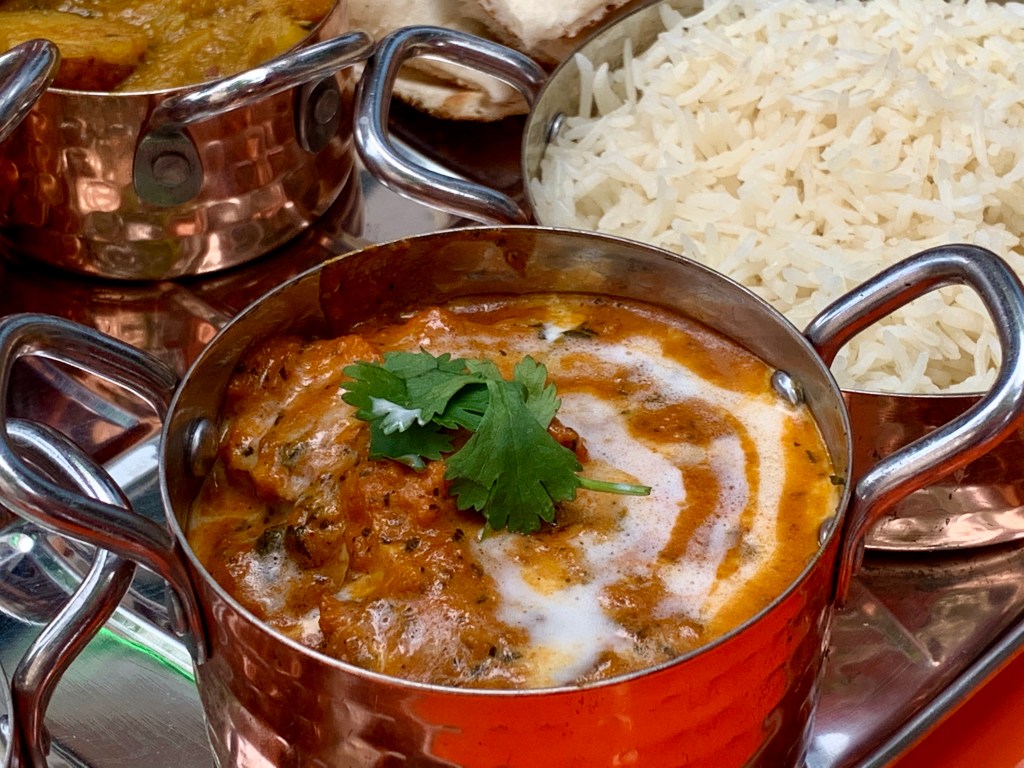 The main menu features a variety of traditional Indian curries:  a rich and creamy tomato-based tikka masala; korma with a mild mix of spices, cashews and yogurt; and a spicy, slow-braised vindaloo, which is a Goan curry of lamb, goat or beef with potatoes. There’s also a saag curry made with baby spinach, fenugreek and other Indian greens. Soak up every bit of gravy with pillowy rounds of butter-drenched naan.