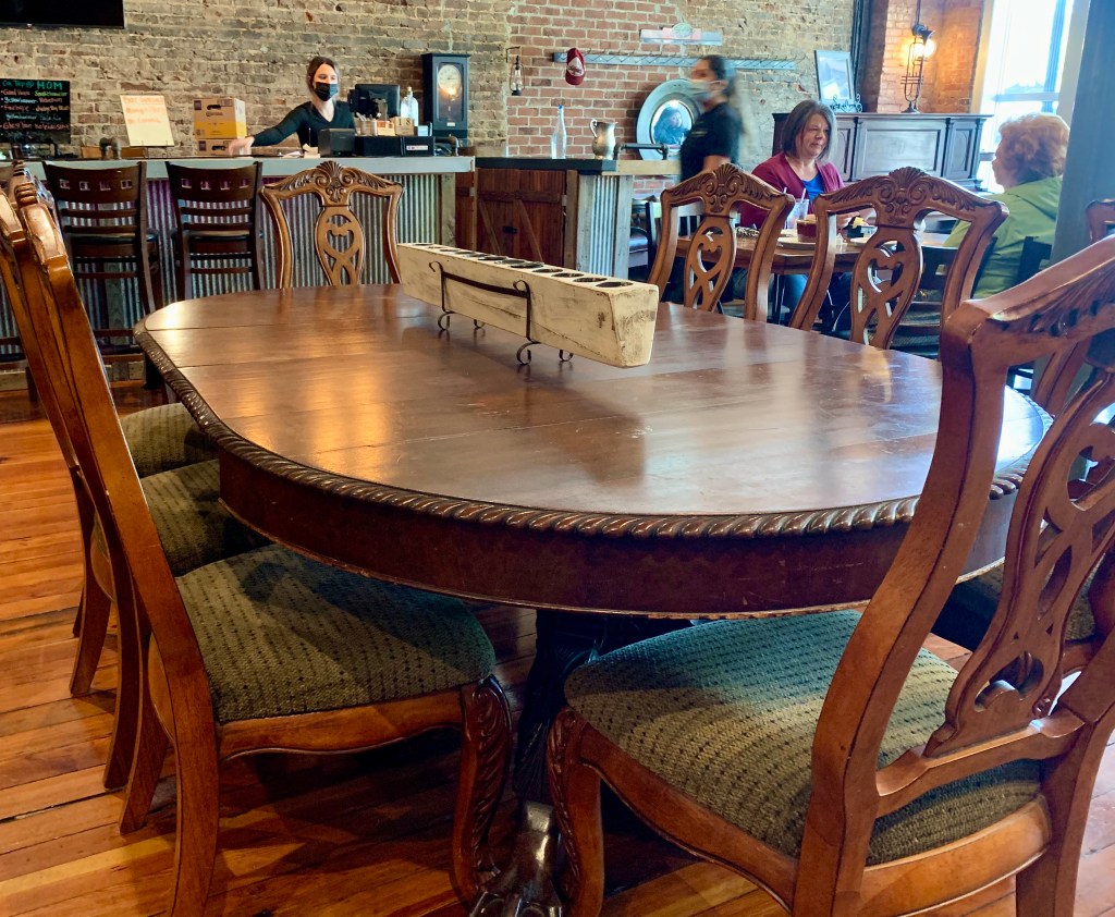 Today, the large storefront windows shine lots of light into a main dining room decorated with vintage photos and furnished with an eclectic assortment of beautiful antiques including small and communal dining tables, pianos, a sofa in a cozy waiting area, copper and wooden bowls on the tables and various other interesting pieces. Many of these things came from the antiques store Hubbard used to own. Her favorite piece is an old ice box that she bought more than a decade ago when she was campaigning for her first term on Oxford’s City Council. It was sitting under a woman’s carport. Now it’s tucked into a short hallway that leads to two private dining spaces—one a small jewel-box of a room with glass windows that offer airy privacy and the other, a long, narrow room, anchored by a beautiful carved wooden bar, where Hubbard started her restaurant some eight years ago.