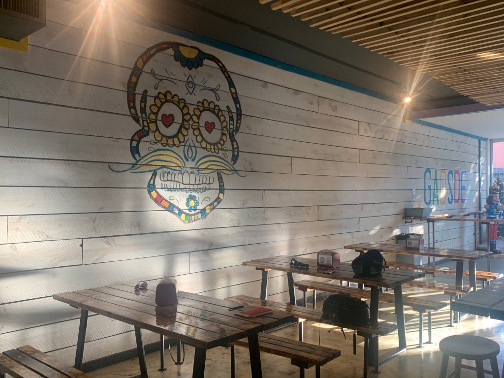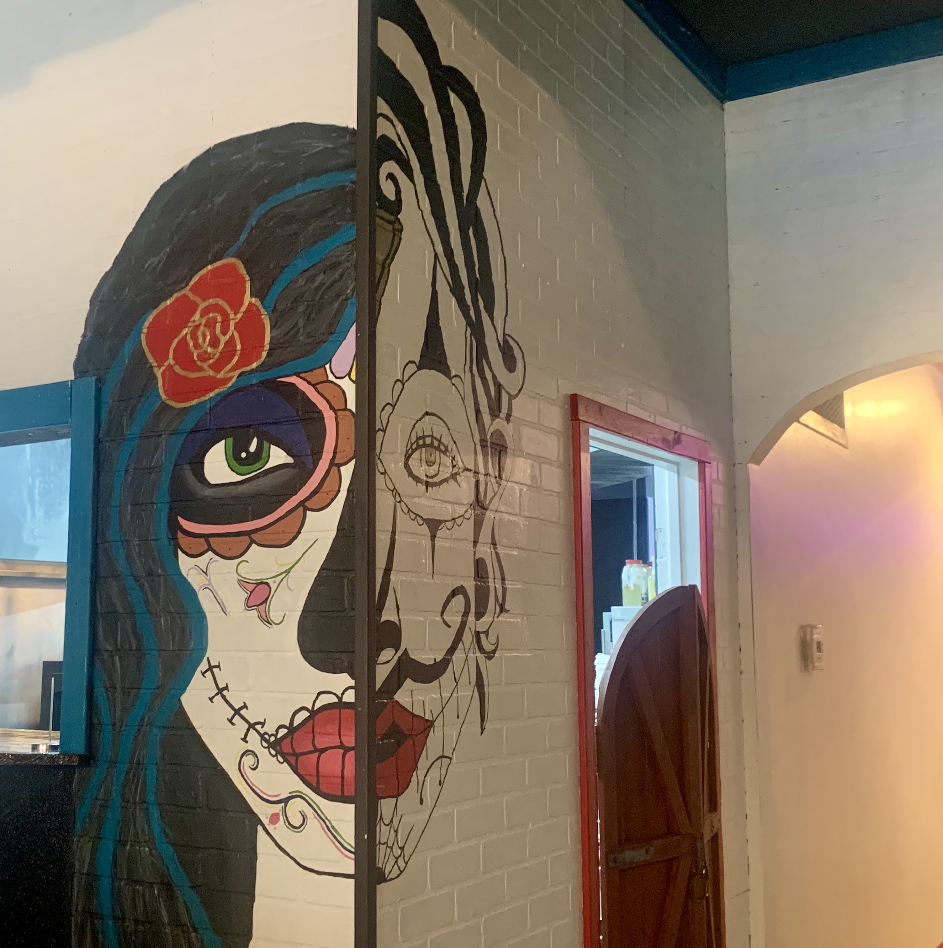 The largest wall in the dining room features a huge, colorful calavera (skull) painted by an artist from Atlanta. The rest of the wall is intentionally empty—a blank canvas of sorts waiting for this community.