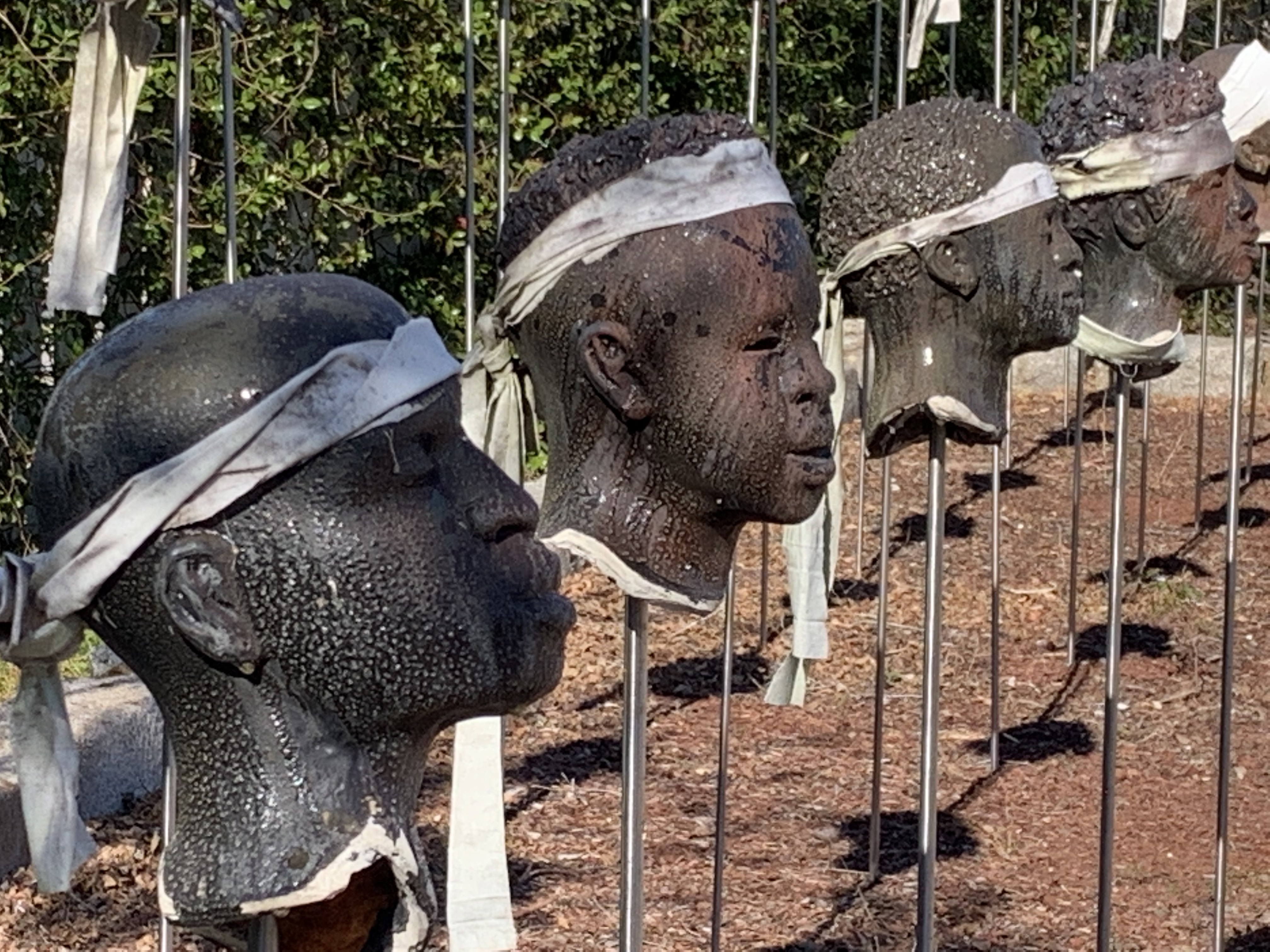 The memorial to the 1811 German Coast Uprising is, by far, the most shocking exhibit here. Dozens of Black, life-sized men’s heads stand on sticks in the ground. It’s a brutal display of unforgettable art. About 500 slaves—armed mostly with hand tools—participated in the uprising, which was the largest slave revolt in U.S. history. Their goal was to escape from the River Road plantations (including this one) to New Orleans. Most never made it that far. Many of the captured were killed — and their decapitated heads were put on sticks along the river to terrify and dissuade others.