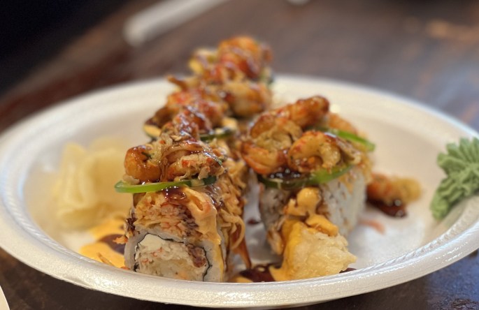 A few years after he bought the business, a customer suggested Zhu add sushi to the menu, so he did. There was a bit of a learning curve, he says, so he made sushi with fried shrimp to show people that “all sushi is not raw.” Zhu says he started off giving away pieces of sushi to get customers to simply try it.