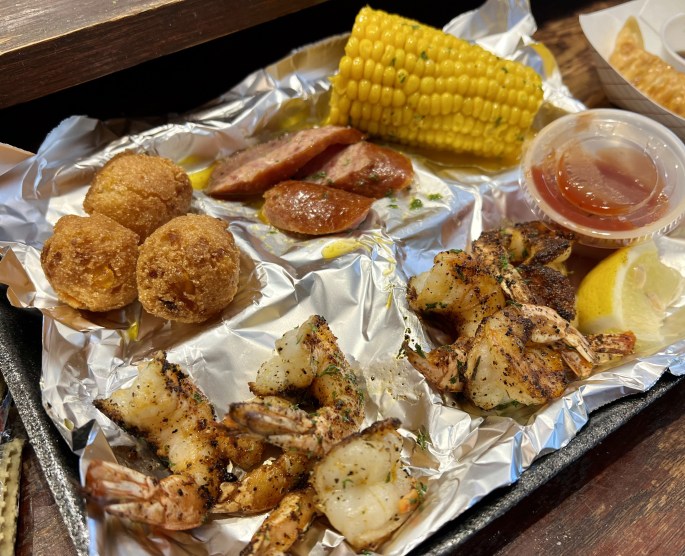 Zhu, who is from China, bought the restaurant in 2012 from a Vietnamese family. They were from Mobile and ran a fishing boat in the Gulf, he says. It was named Bayou Fresh Seafood then, and he kept the name. Then he served fresh seafood dinners with Southern sides and some Cajun flavor, if you’d like, which he continues.