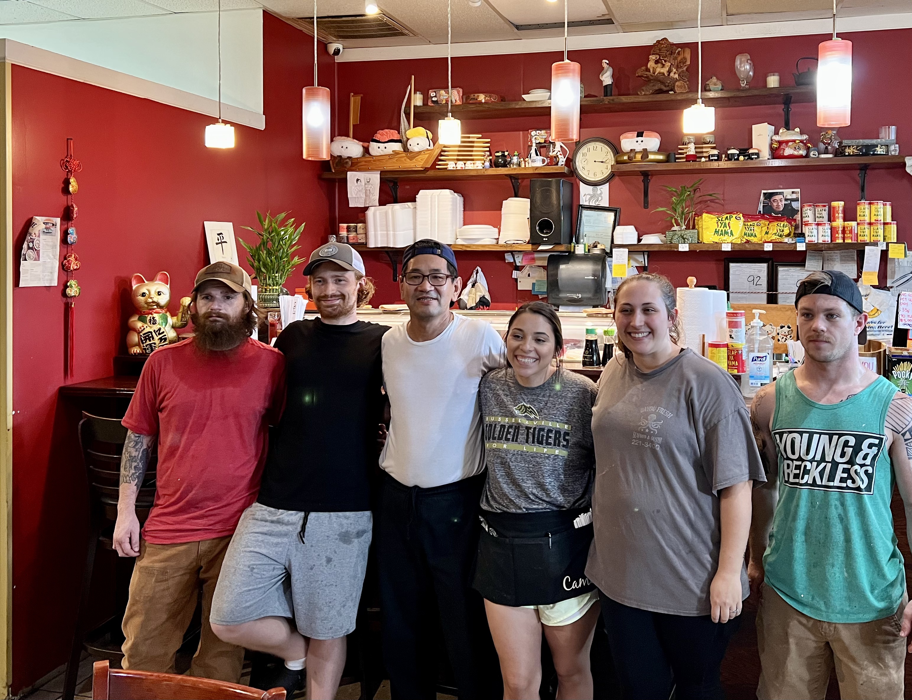 They celebrate Christmas and Chinese New Year at Bayou Fresh Seafood. Inside, you’ll notice two mounted trophy bass on either side of a tasseled red wall hanging decorated with Chinese symbols. The whiteboard of daily specials on a recent Tuesday included frog leg dinners and Ramune Japanese soda, a shrimp bowl and baby octopus nigiri, homemade seafood gumbo and salmon roe sushi. There’s a waving lucky cat figurine near the sushi bar and a University of Alabama sign across the room. At Bayou Fresh Seafood, the folks who work here “know what some customers want the minute they walk in,” says Camelia Castillo. And if you’re new, they’ll probably know you by the time you leave.