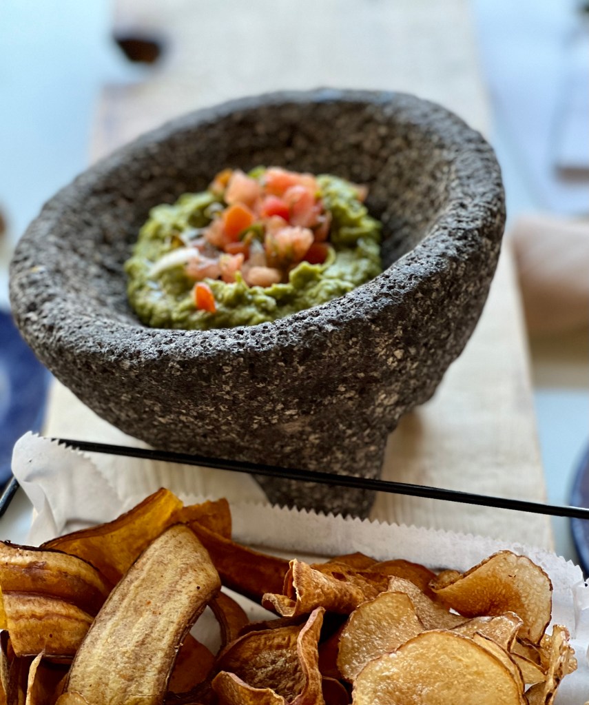 So, instead of endless chips and salsa and piles of nachos and chimichangas on shredded lettuce, you will find crabmeat enchiladas with a chile guajillo sauce and fresh slaw; a tomatillo lobster soft taco served on a cream sauce with roasted corn and peppers and a topping of crisp sweet potato chips; and “iron skillet mussels” cooked in a chipotle, garlic, and chardonnay broth bright with fresh lime juice. Fresh guacamole comes with house-made sweet potato chips, potato chips and tortilla chips.