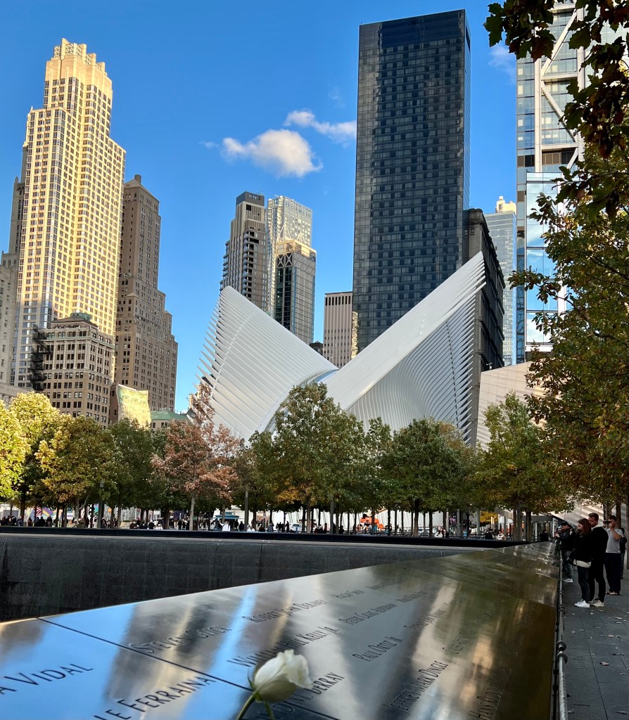 Then we visited the 9/11 Memorial. We didn’t get there in time to visit the museum, so that will be another trip. But walking around the memorial was an experience, too. This is, of course, a tribute of remembrance to the 2,977 people killed in the September 11, 2001 terror attacks in New York, Pennsylvania and at the Pentagon as well as the six people killed in the World Trade Center bombing on February 26, 1993. This was the first time I’ve seen this space, and I was awed by the sheer size of this memorial. It’s a moving and beautiful place.