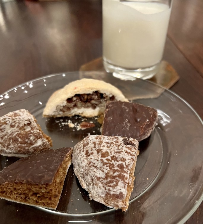 And we ended our evening with global desserts leftover from our holidays: Mexican eggnog, Lebanese cookies and German gingerbread.