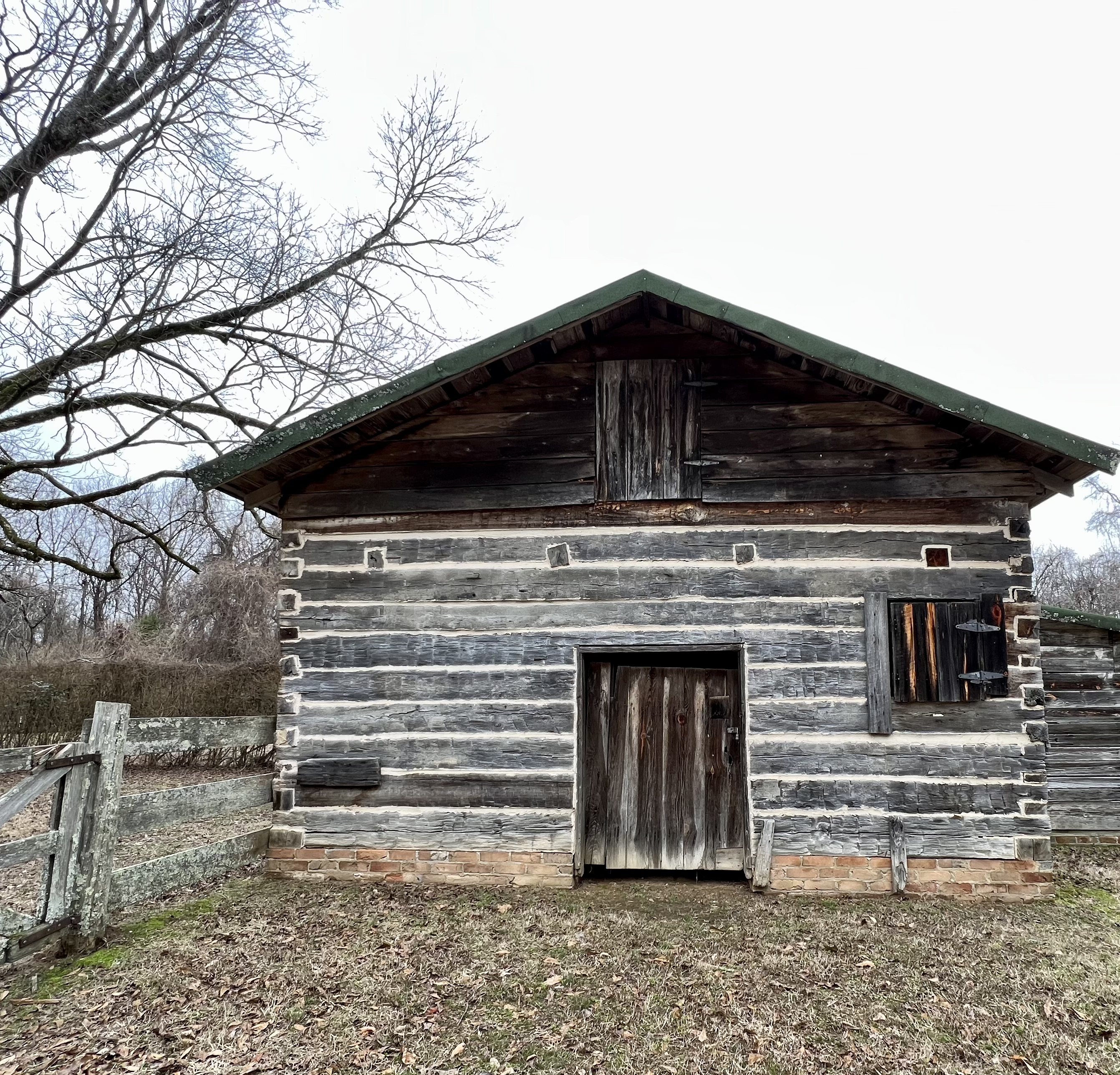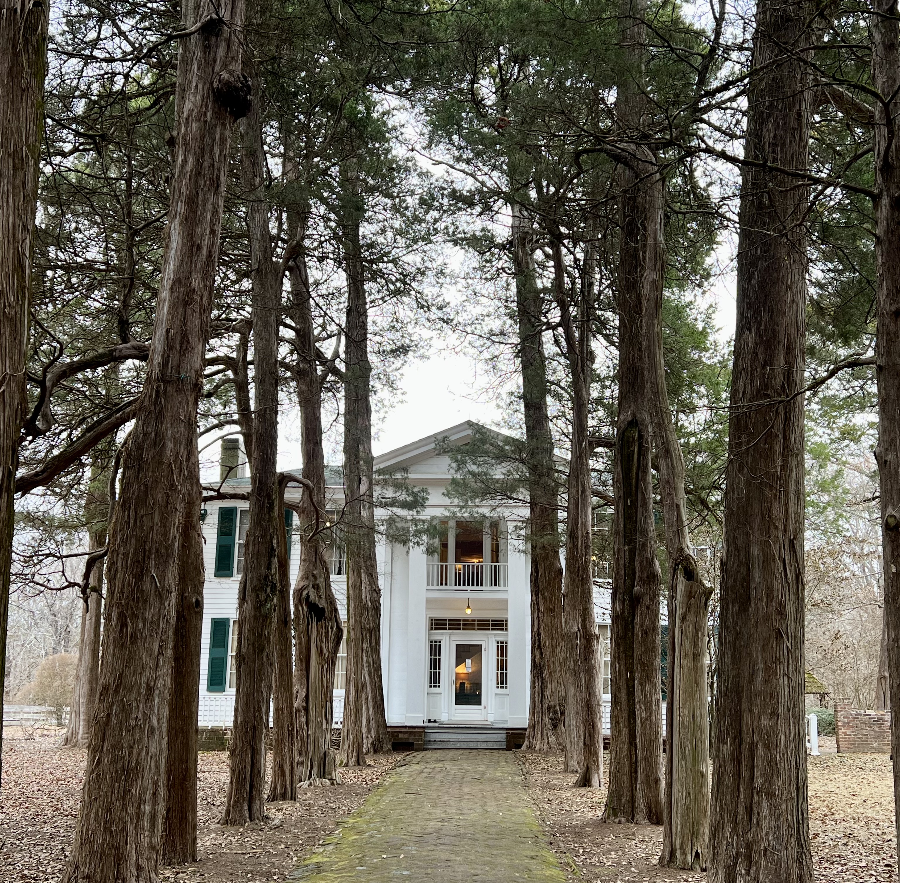 I wandered around the grounds–awestruck by the fantastically gnarled osage orange trees, the stately cedar walkway, the remnants of the circle garden, the English knot garden, the buildings (especially the log barn) and the lovely solitude broken only by birds calling to each other. It’s a beautiful and mysterious place. It feels really good.