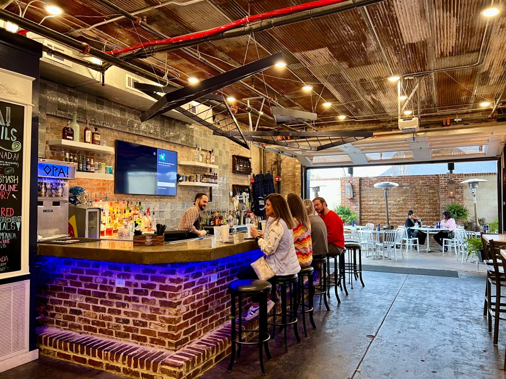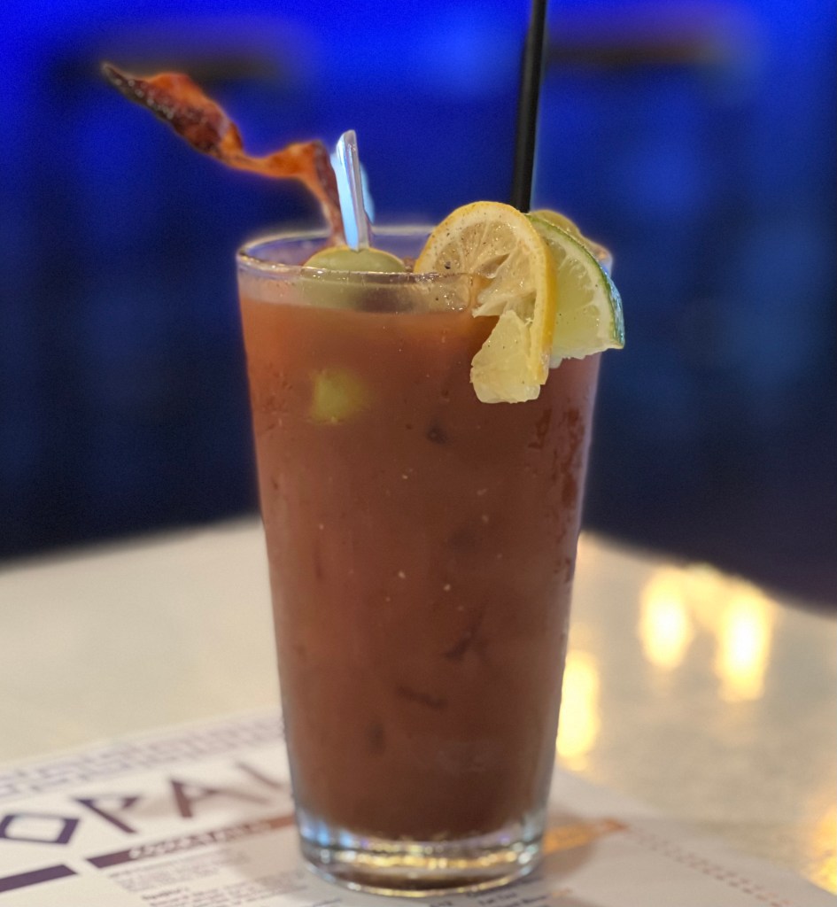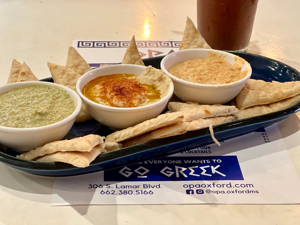 I had a quick bite at Opa!, a Greek restaurant around the corner. The Bloody Mary here is a signature drink made with Titos and ouzo, filled with pickled things and topped with a piece of bacon. I sampled the hummus trio–traditional, red pepper and basil pesto hummus. Delicious!