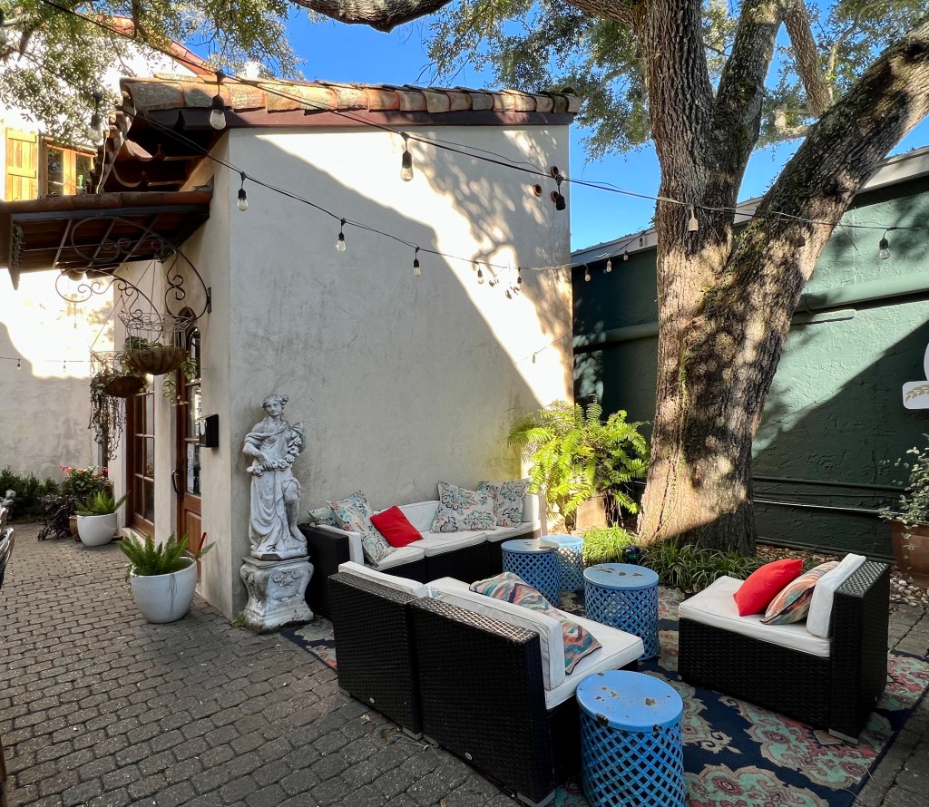 Perhaps most striking, and one of the main reasons the Peryers relocated from another space nearby (where they enjoyed several successful years) is the large, beautiful, meandering, cobblestone-paved courtyard. It’s deeply shady with native trees and shrubs, comfortable seating, and lots of tropical plants in interesting planters. “You can relax, have a glass of wine, some great food and just pretend you’re somewhere else,” Wade says.