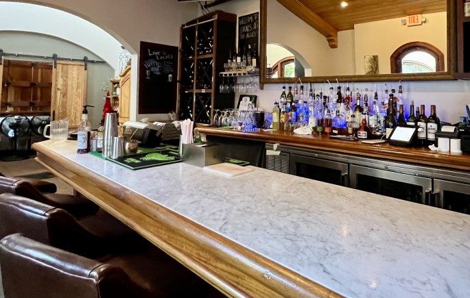 The restaurant is in a beautiful Tuscan-style building with wood beams and terracotta tiles. There’s a spacious porch, breezy with ceiling fans; a cozy, romantic private dining room; a bright, window-lit front dining room near the busy kitchen; and THE BAR with daily happy hours, full service, inventive cocktails, wine and local craft beers at a handsome mahogany and marble bar.