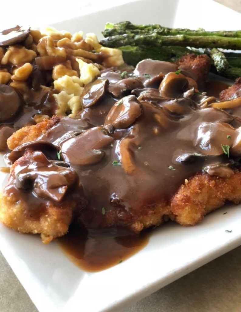 “German food is actually comfort food,” Amy says. “It’s actually considered to be a very simple dish. The schnitzels are chicken-fried chicken, basically—chicken-fried veal, chicken-fried pork.” The meats are hand cut, pounded out, breaded up and pan fried. “Then we have different sauces. We have a Rahm sauce, which is a cream-based sauce with mushrooms. We’ve got a Jaeger gravy, which is a rich brown sauce with mushrooms and onions, and we have some different types of schnitzels. So, we’ll do a Bavarian, which Is stuffed with delicious cheese and mushrooms and onions. (It’s one of the most popular dishes here.) We do a couple of chicken Cordon Bleus. We do a couple of veal Cordon Bleus. German food is very simple, and it’s very accessible to pretty much everybody.”