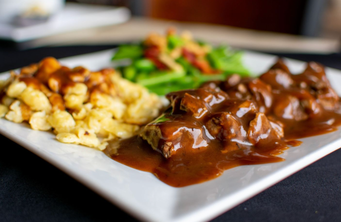 “We’ve added things over the years,” she says. “One of our most popular dishes right now is called Geschnetzeltes; I call it ‘hunter’s stroganoff,’ because, again, it;s one of those circumstances where people will read that and be like, ‘Nope, not trying it.’ But basically, it is a stroganoff. It’s cubed pork with mushrooms and onions. We brine it, and we put a cream sauce on it.” This is Amy’s personal favorite dish. “I think it’s the brining of the pork that makes it,” she says, “because it’s just so tender. And then the onions, the mushrooms, the cream sauce, they all just work together. We put it over the house-made spätzle. My cook does a really fantastic job with it. We do it all small batch.”