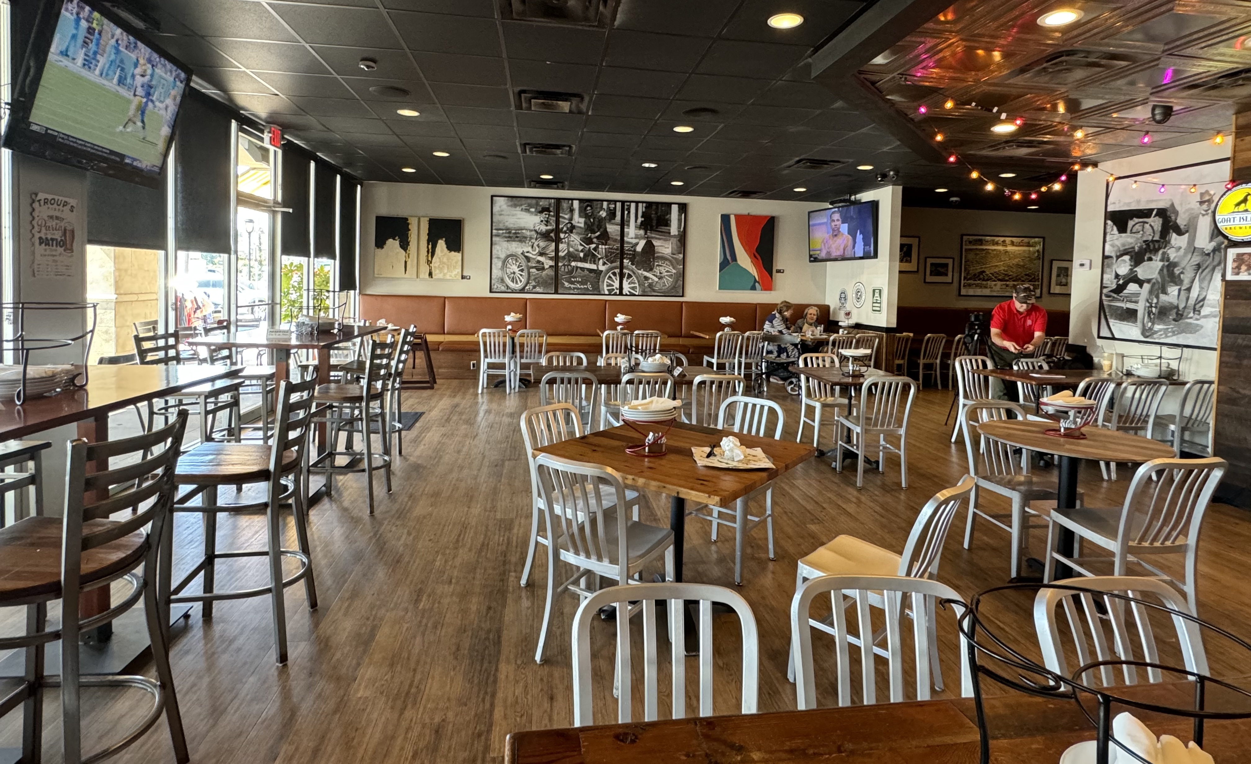Terrill’s great grandfather, grandfather and father were all named George Troup Brazelton. You’ll see photos of the great grandfather on the walls here. He built a prototype race car, had hopes of turning Lakeshore Drive into a speedway and realized the dream, in the early 1900s, of bringing the streetcar line over from downtown Birmingham to Homewood (you can still see tracks in Edgewood). The Troup’s logo (a fuel gauge indicating full) and the table numbers, which look like race car numbers, pay homage to that inspiring, innovative man.