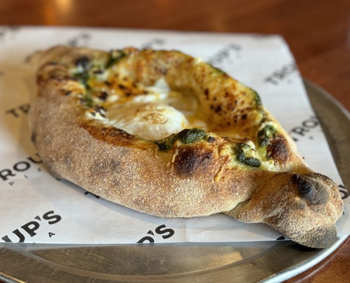 It’s a boat made of pizza dough filled with cheeses, pesto and herbs and topped with a runny egg. “It’s delicious,” Ashley says. “You just pull it apart and dip it in the middle.”