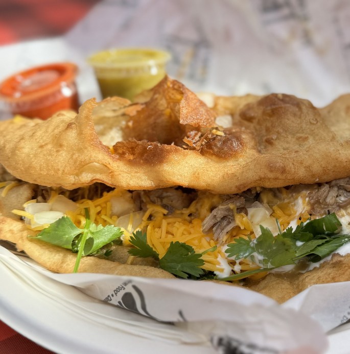 Several of us got the day’s special of carnitas in that amazing fry bread. The most popular dish—the combo with beef (spiced to your liking), beans, cheese and lettuce—also was delicious. The place is small and cozy with indoor seating surrounded by native art and empowerment posters and outdoor seating at picnic tables in a small cactus garden.