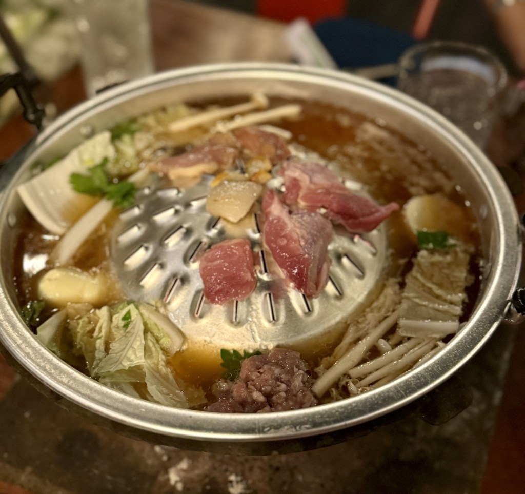Mr. Baan’s specializes in charcoal-grilled Thai barbecue. “Mookata” translates to “pork on a grill” and is a cook-it-yourself barbecuing experience. It consists of a domed grill surrounded by a moat of broth, which is enriched by the drippings of the cooking meat. A mookata set comes with various marinated meats (steak, chicken, pork), rice noodles, fresh vegetables (cabbage, peppers, onions, enoki mushrooms), eggs and dipping sauces.