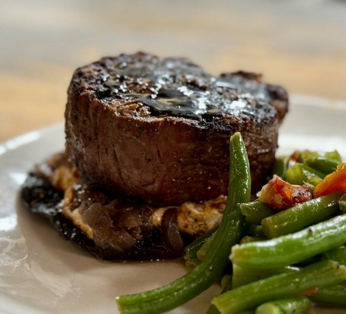 “It’s a portobello cap with chipotle goat cheese, caramelized onions and the filet. And then I top it with a pork-balsamic reduction. And when you eat all that together, it’s magic. They were nervous about that being on the menu. … So, we do have two filet options—one regular, one like that. In the past month, we’ve sold more of the portobello ones than we thought.”