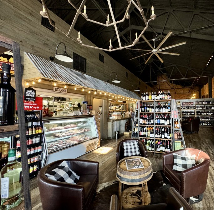 It’s a butcher shop with meats cuts to order; it’s a wine shop with well over a thousand bottles from around the world (there’s no corkage fee if you pick one to drink while you’re here and there are frequent wine tastings and regular wine dinners); it’s a general store full of locally sourced ingredients such as honey and cheeses and Dena’s own family-recipe gourmet barbecue sauce. There’s a handsome bar with craft cocktails and mocktails (they try to cater to everyone) and a breezy patio festive with lights.